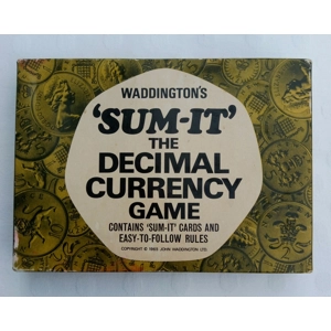 As it says on the box, "It's the card game that counts!" Basically the idea of the game is to collect seven cards as quickly as possible which add up to the total stated on the "Sum-It" card. Considering the great age of this item it has survived in excellent condition. The box is strong and intact. Apart from slight rubbing along edges and corners there is no other damage or fading of any kind. The white, black and yellow design is very simple but has that distinctive style of the 1950's - 1960's. The yellow card storage compartment slides out and is in pristine condition. The cards themselves are of standard playing card size. All 57 cards are present and are clean and unmarked. The faces show amounts in pre-decimalization £.s.d while om the reverse, in predominately red, is the name of the game as well as stylised floral motifs. The double-sided, folded paper instruction leaflet is also included, which is also in good condition apart from a small patch of discoloration. We recommend this game for those of you familiar with £.s.d as it may be confusing for those of us from the decimal age. A really fantastic item for a collector of vintage card games, as a display item in a themed room or for someone wishing to remember their childhood.