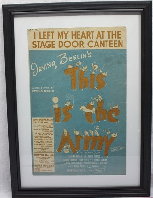 The song is taken from the 1942 Warner Bros. film "This is the Army" directed by Michael Curtiz and starring amongst many others Lt. Ronald Reagan, who was to go on and become the President of the USA. The item is greeny-blue and brown in colour. On the front along with details of the film is the title of the film formed by cartoon figures of army musicians. Bearing in mind the age of this item, the use it must have had and being printed on war-time utility paper it has survived well. There is no fading but some slight surface blemishes including the initials of the original owner, as well as slight creasing which all adds to it's vintage look. Displayed in a black frame this item would be ideal for any Irving Berlin fan, a film or musical enthusiast or could be used as a one off piece of decorative art suitable for any room of the house.