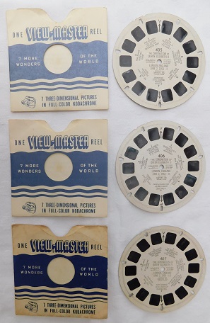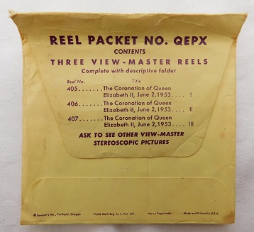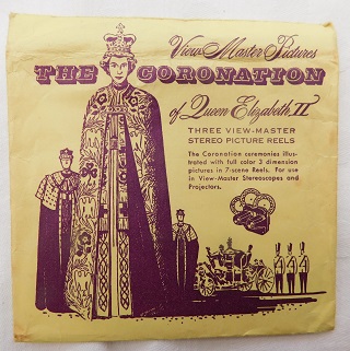 Have a front row seat to one of the biggest events in post-war Britain. The package consists of three reels, depicting in total 21 3D full-colour Kodachrome pictures of the Coronation in 1953, together with a descriptive pamphlet all housed within an envelope. The pale yellow, paper envelope is unmarked, fully intact and is suitably decorated with a brown coloured representation of the Queen in full regalia. It is slightly creased and has a horizontal fold running along the top. The folded pamphlet, which is printed in purple, describes aspects of the Coronation. Again it is in good condition with some slight creasing and folding of edges. Each of the three film reels (#405, 406, 407) are in excellent condition and comes in it's own View-Master envelope. For it's age this item appears to have had minimal usage. A great gift for a collector of Royal memorabilia or View-Master reel collector.