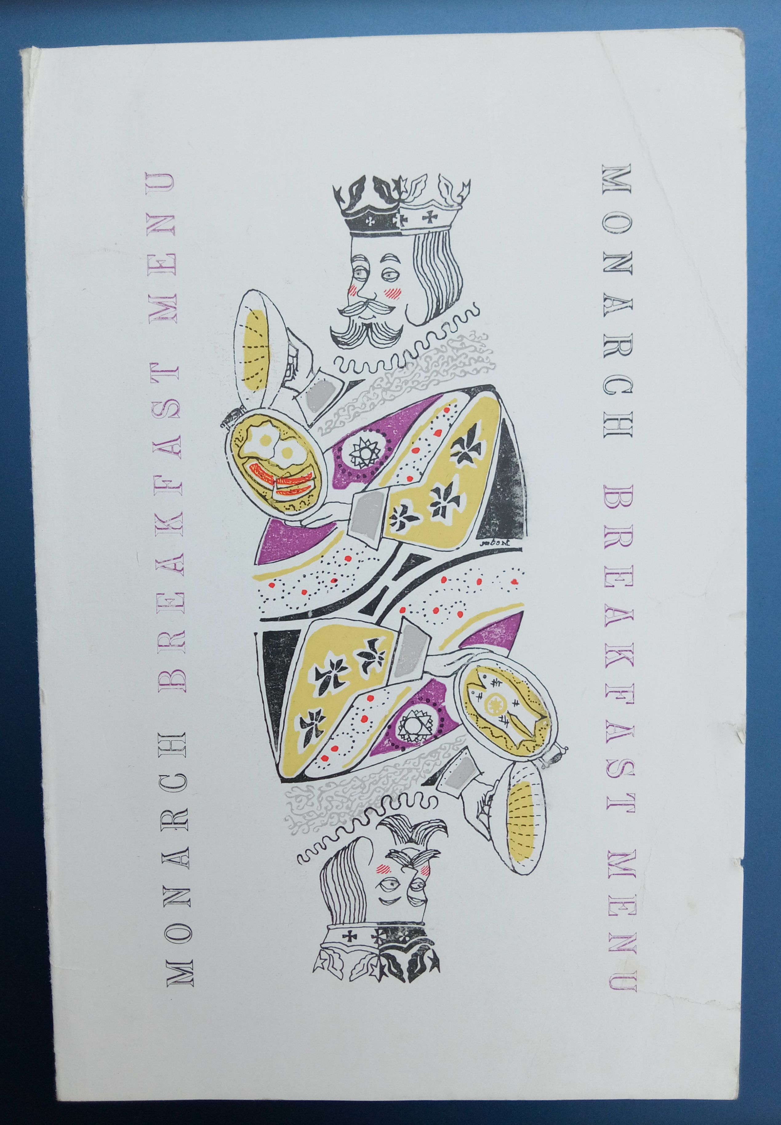 The menu itself is a work of art, a perfect snapshot of 1950s design sensibilities. The front cover features a wonderfully whimsical illustration in a style reminiscent of a playing card. A king, regal and smiling, holds a silver platter upon which a full breakfast is served, a visual promise of the delicious meal to come. The bright, distinct colours and stylized details are a joy to behold.