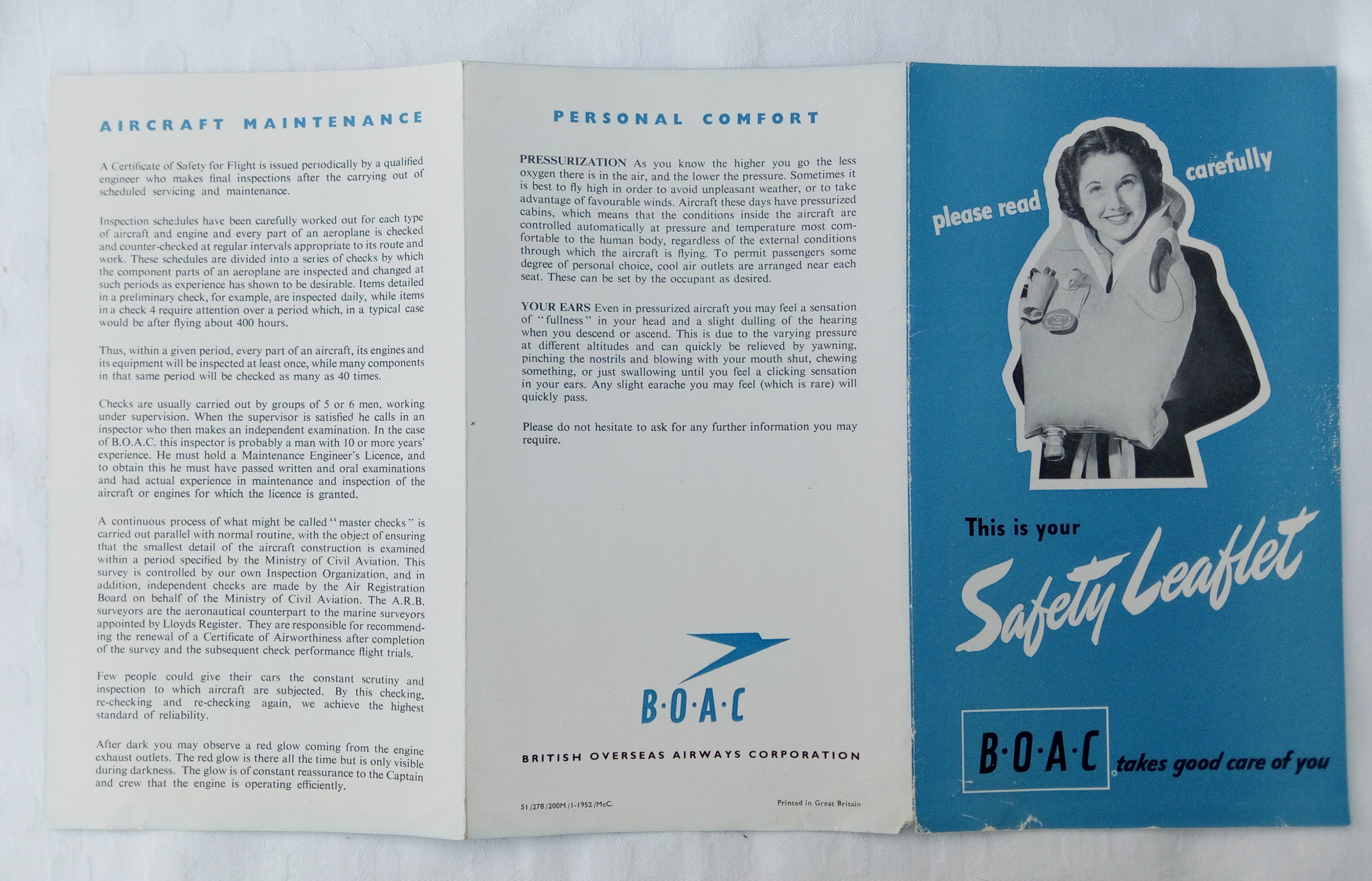 Discover a stunning piece of aviation history! Up for sale is a rare British Overseas Airways Corporation (BOAC) Safety Leaflet dating from 1951/early 1952.