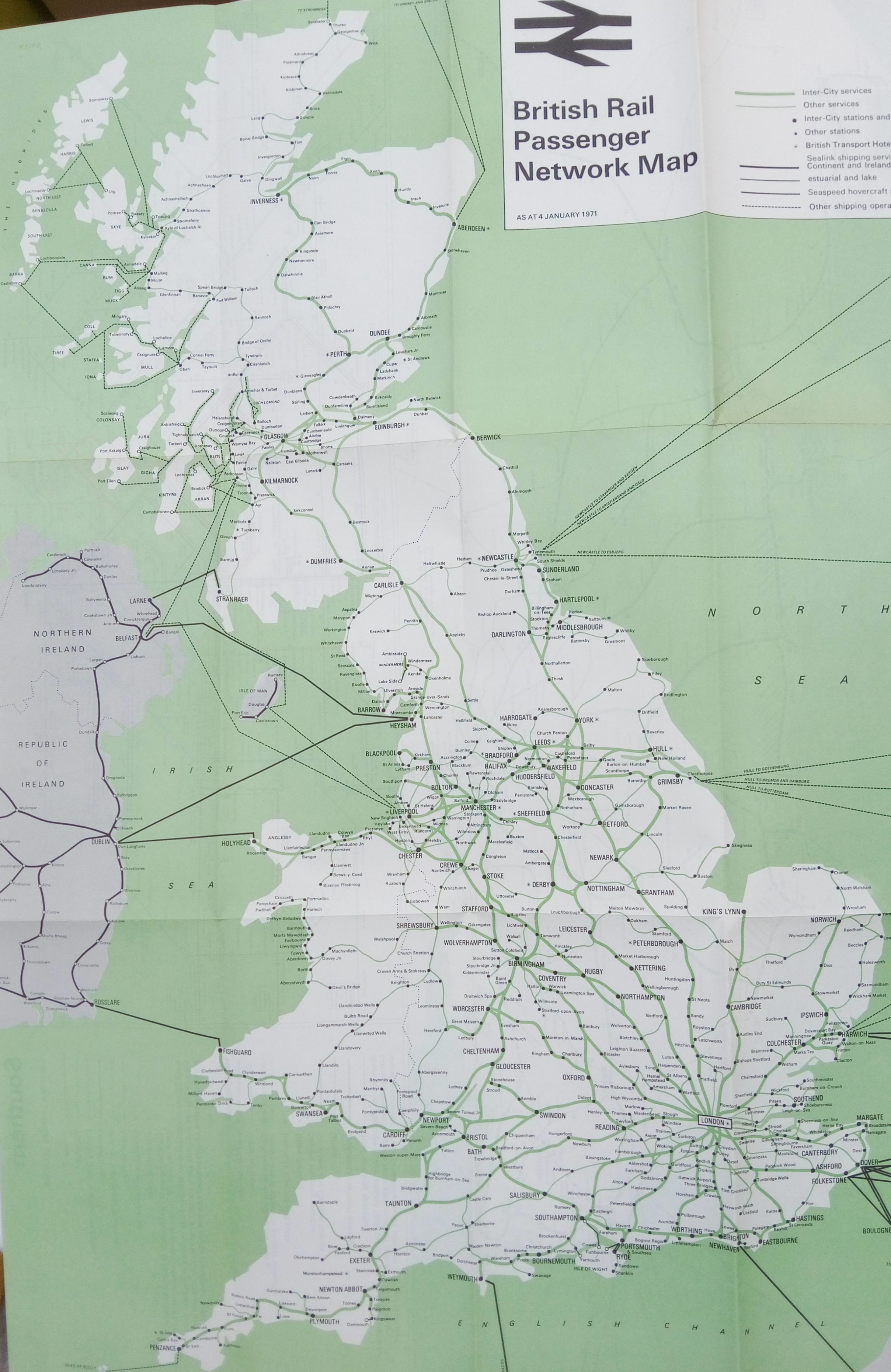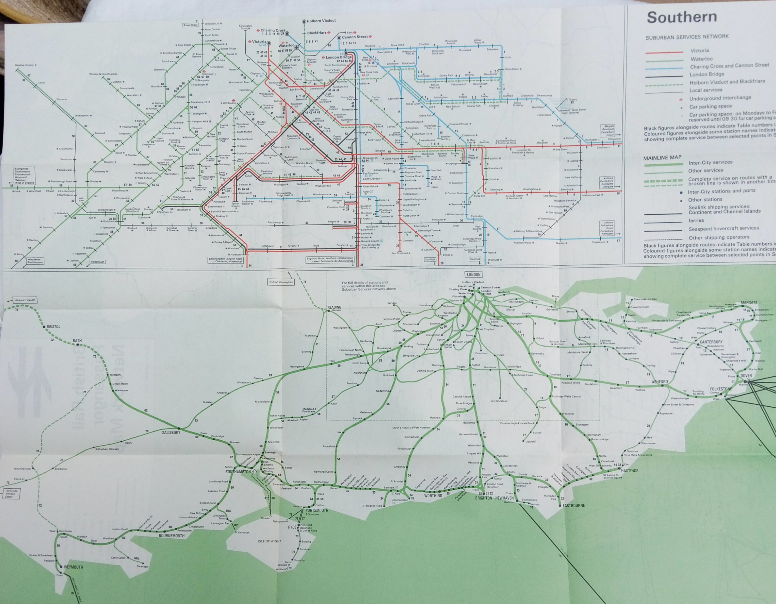 But the real treasure of this offering is the accompanying double-sided paper map, which is in excellent condition. Unfolded, one side reveals the entire British Rail Passenger Network. You can trace the routes from the Scottish Highlands all the way down to the Cornish coast, a comprehensive snapshot of the nation's rail arteries. Flip it over, and you'll find a detailed map of the Southern Region itself, from the bustling heart of London down to the serene South Coast. Every station is clearly labeled, perfect for tracing your way through the network. This side also features a full-color suburban services network map, detailing all rail and underground services within the London area—an invaluable resource then, and a fascinating insight now.