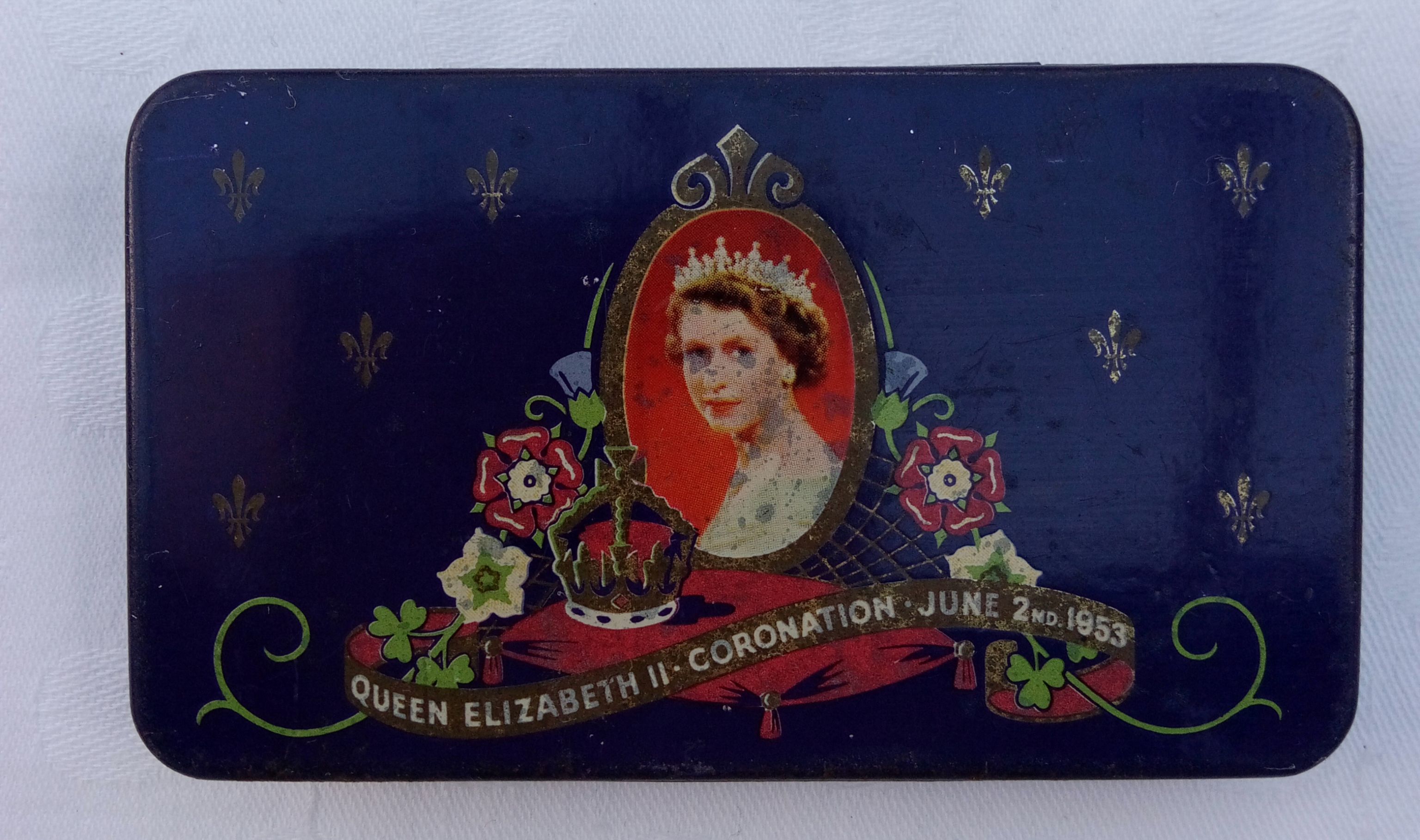 Inside, the surface is worn, with a couple of small, honest areas of rust that speak to its age. Despite these signs of use, the hinge is still in perfect working order, a small detail that ensures this piece of history is as functional as it is beautiful. This isn't just a tin; it's a small, personal time capsule—a charming relic from a bygone era that captures the patriotic spirit and joy of a nation celebrating its new Queen.