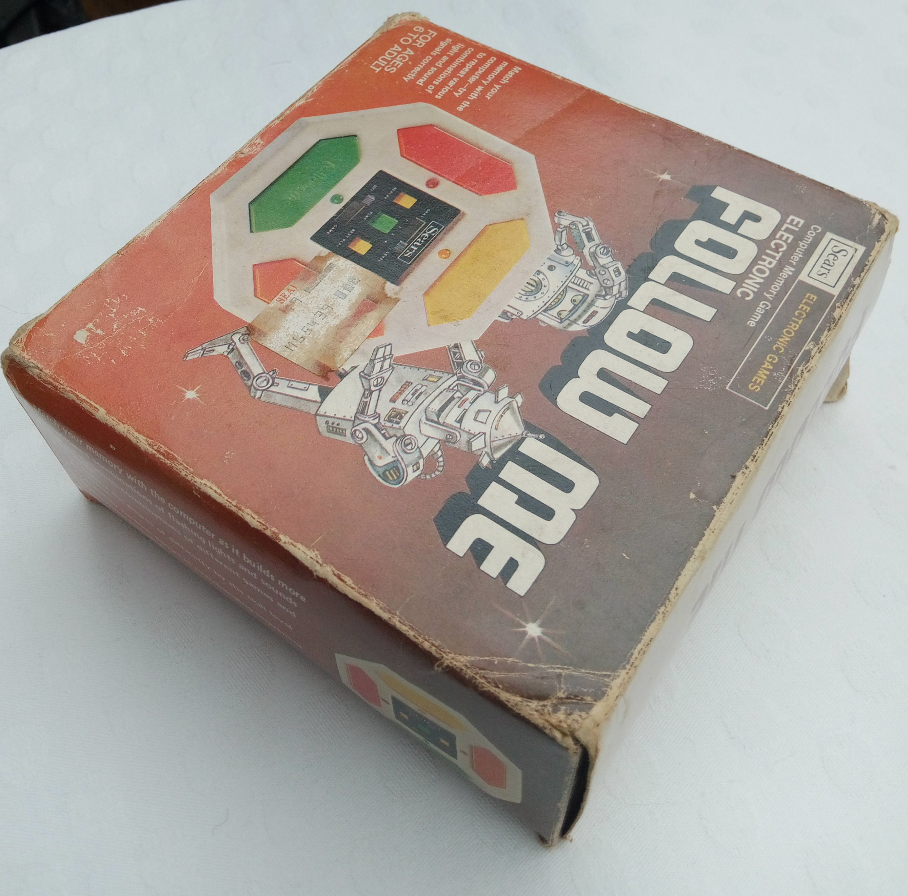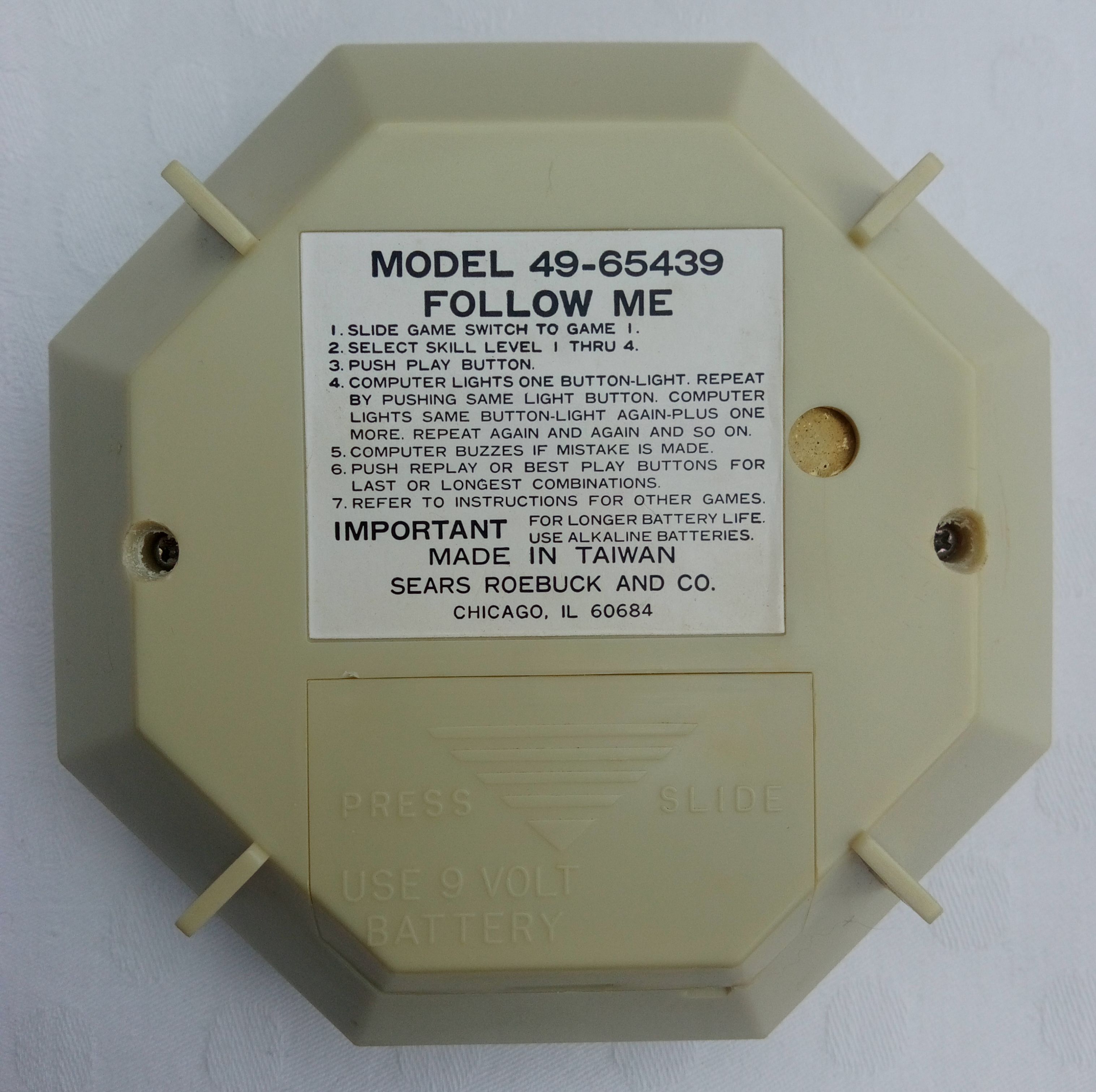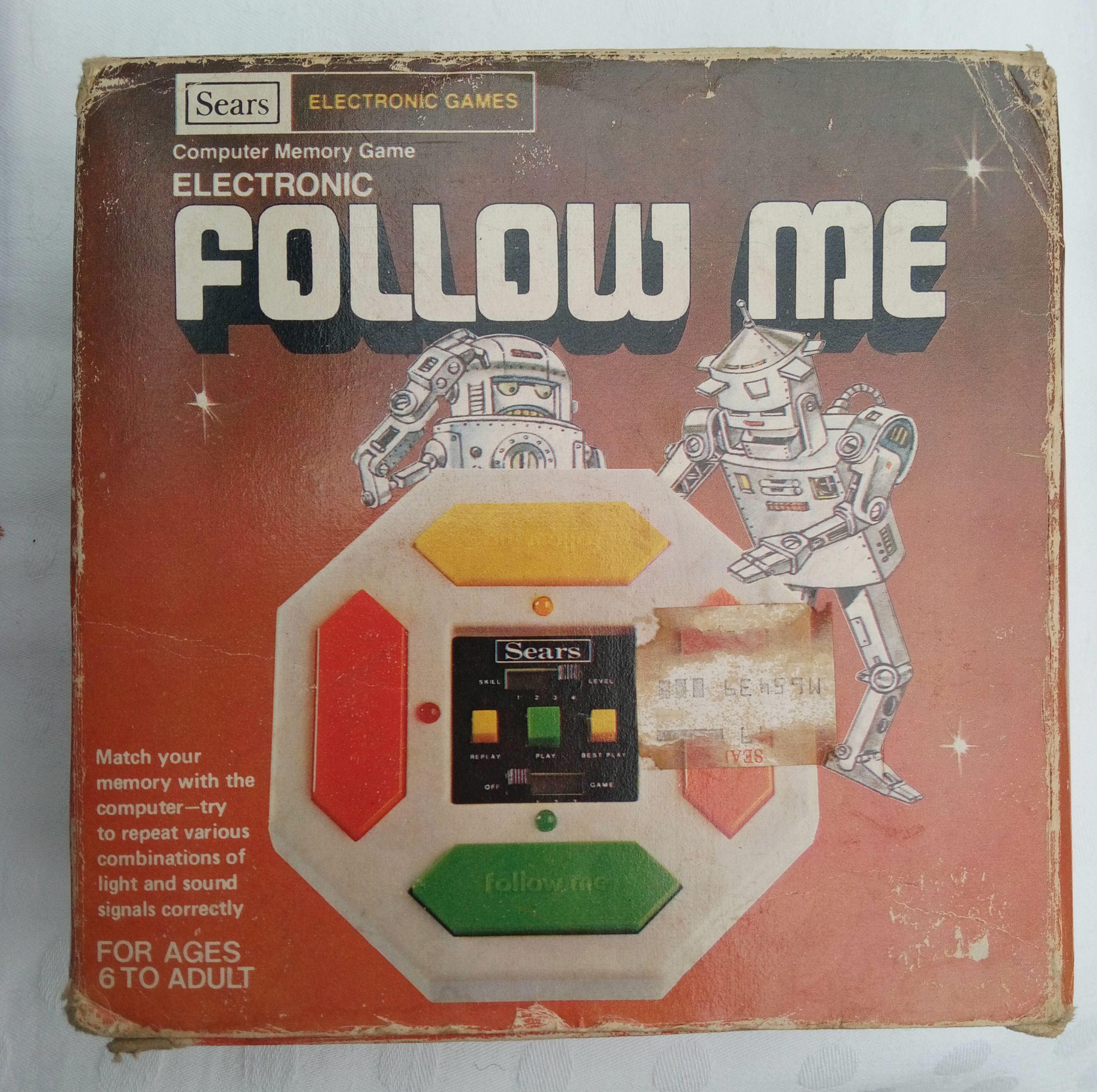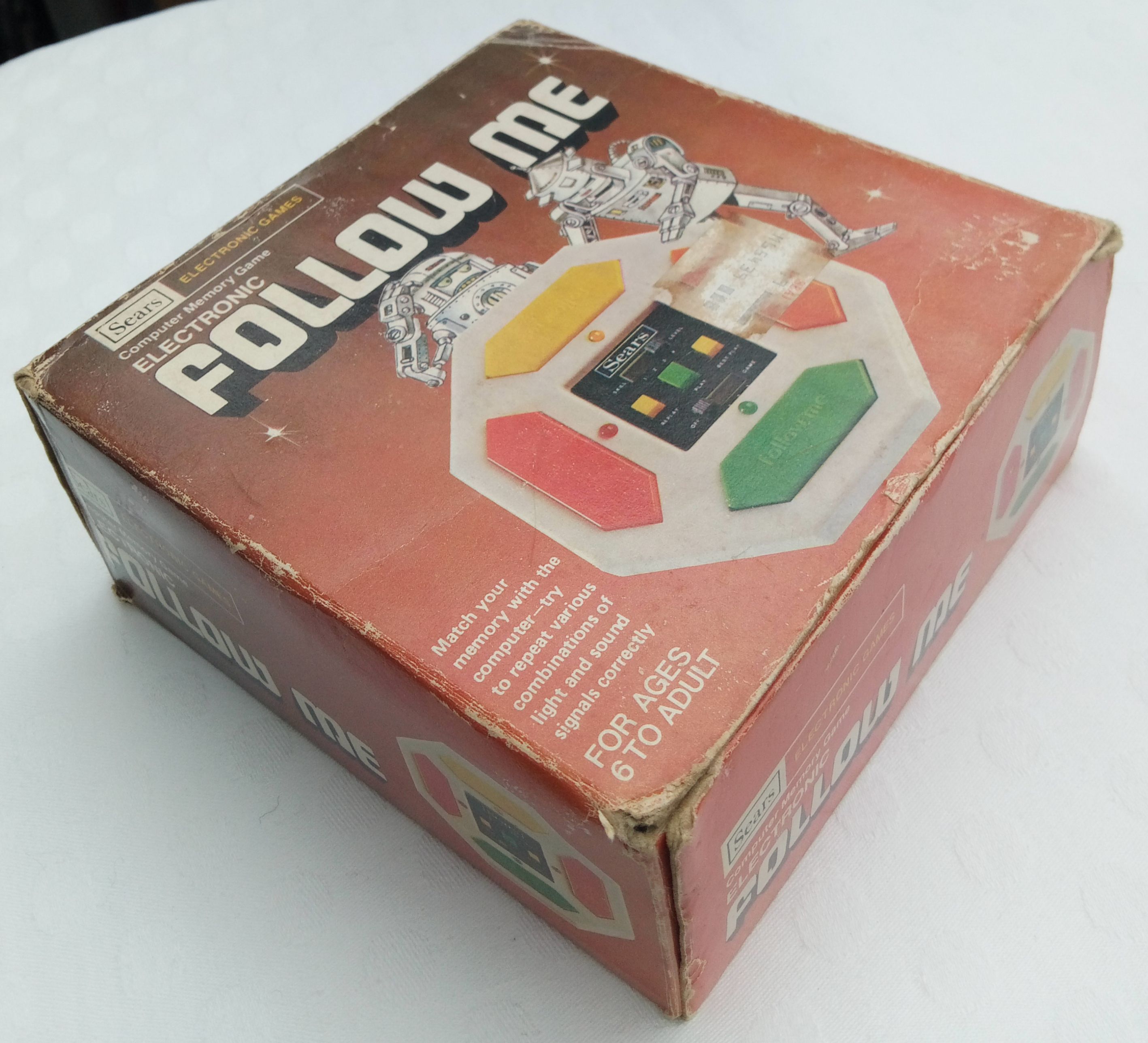 Step back in time with this fantastic piece of electronic history: Follow Me, the computer memory game! Made in Taiwan for Sears, Roebuck and Co., this electronic sequence-following game is a late 1970s gem — a basic yet captivating version of the classic Simon.