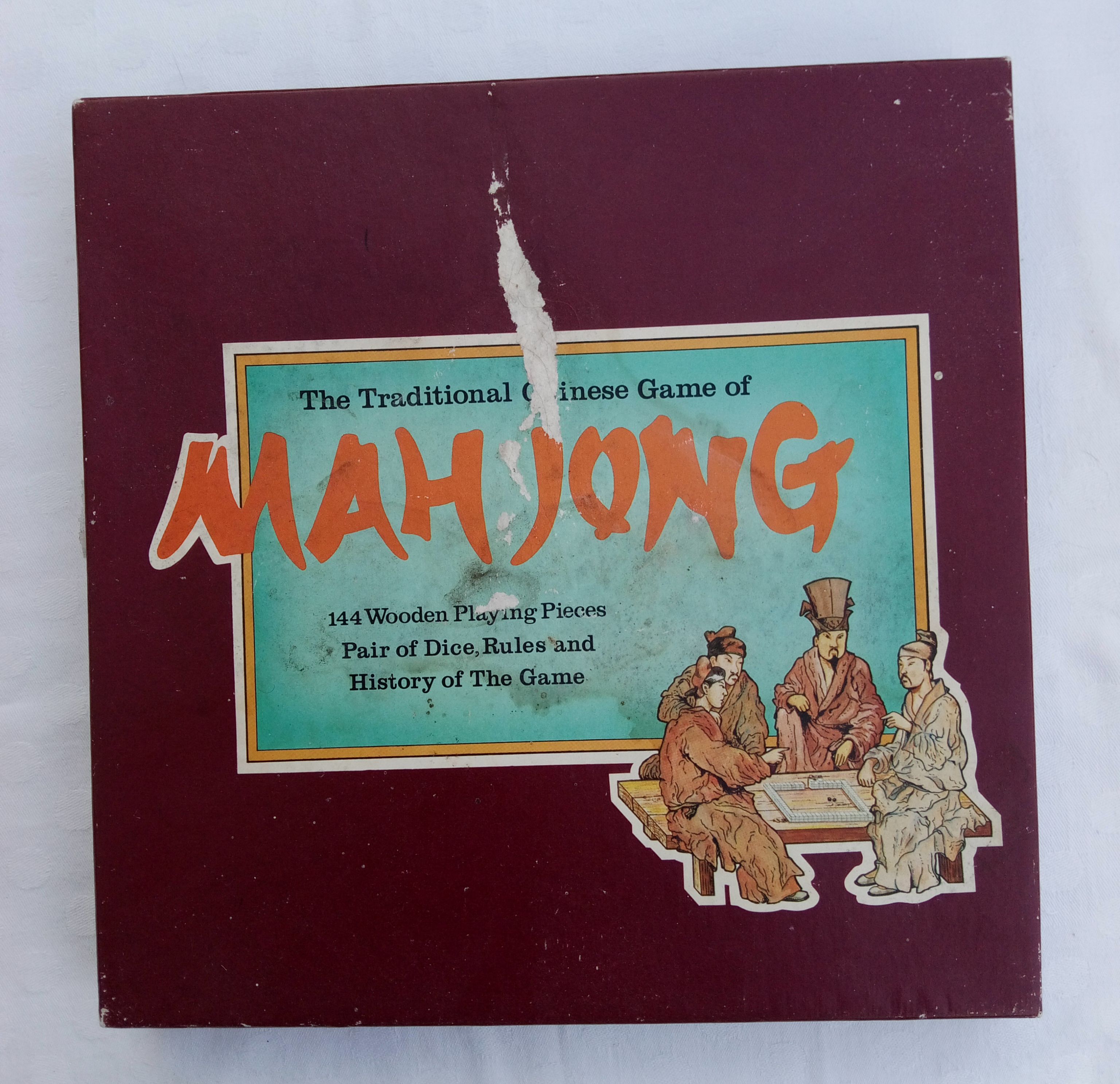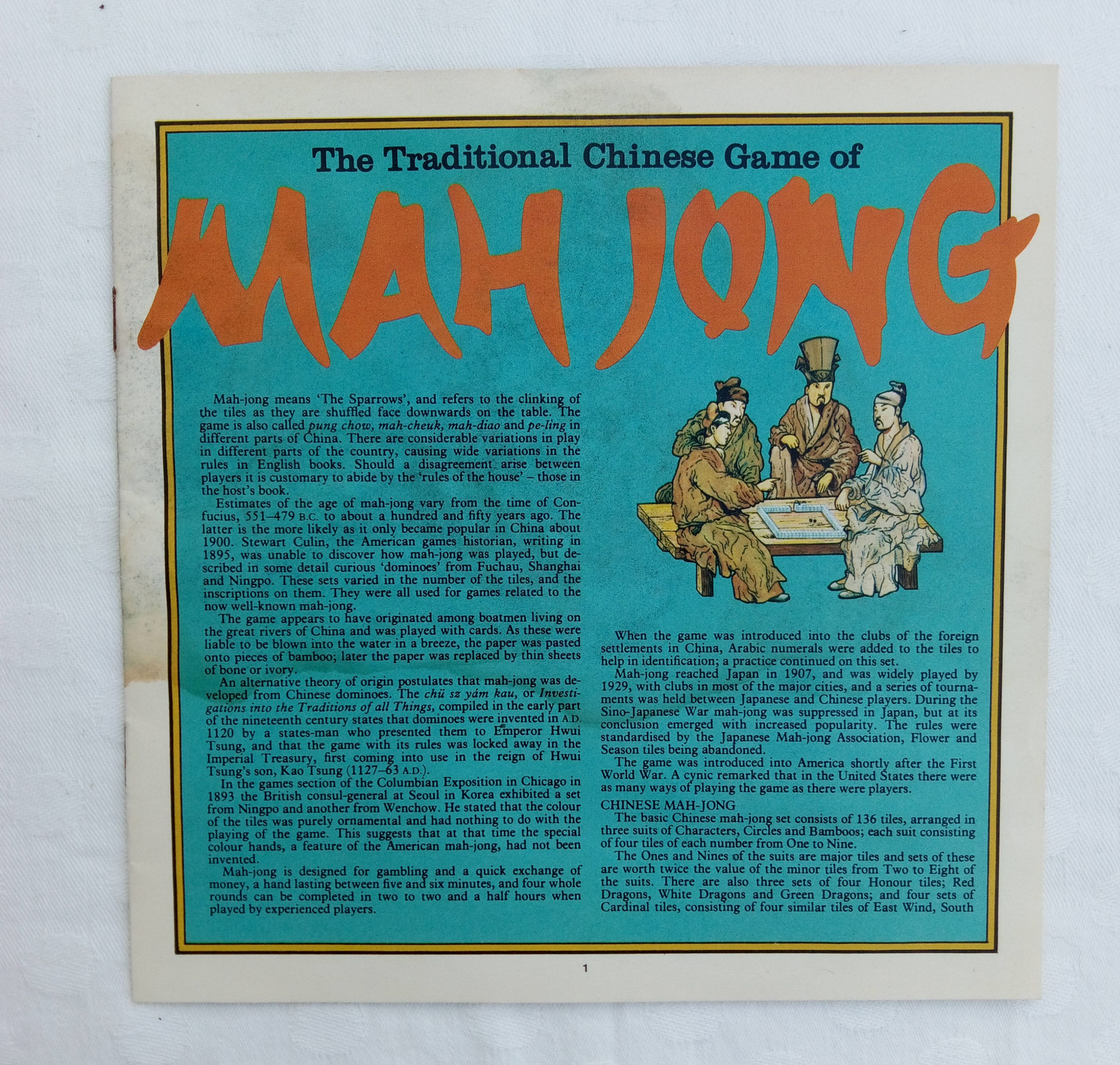 The original instruction booklet is also included, providing a fascinating glimpse into the game's history and teaching you the rules to play. Although the booklet and box show signs of their journey through time—some staining from past water damage and wear on the box’s maroon lid—these imperfections tell a story and add to the set's authentic vintage charm. The lid, adorned with a vibrant drawing of traditionally dressed Chinese people playing Mahjong, has rubbing along the edges and corners and some surface damage from what appears to be adhesive tape. However, these marks don't detract from its overall appeal.