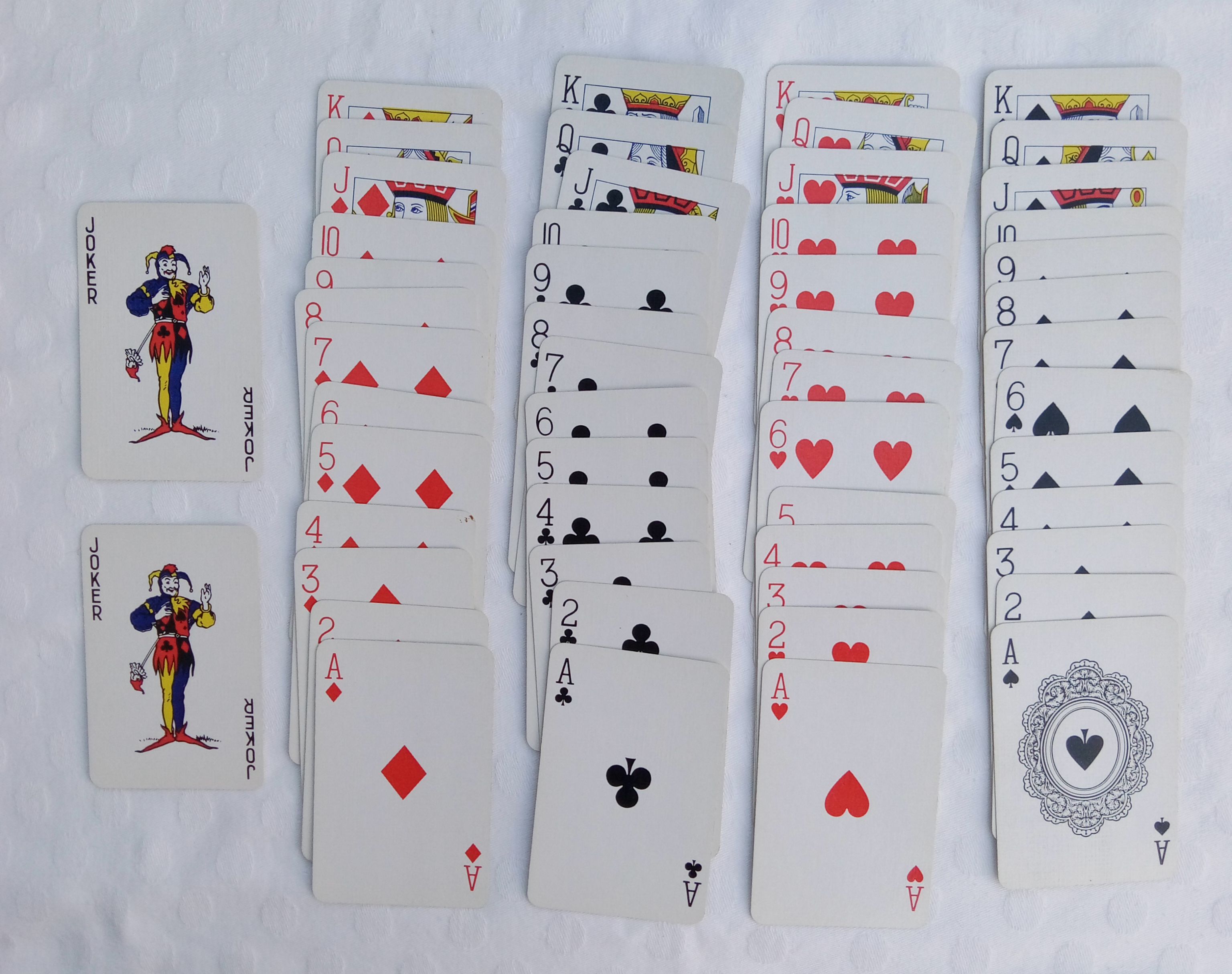 The deck itself is in very good condition, a testament to its quality and careful preservation over the decades. All 52 standard cards are present, along with two jokers. The box, while showing a slight bit of surface wear, remains intact and perfectly preserves its vintage charm. The design on the front of the box is a work of art in itself, featuring a classic joker seated with an impressive fan of cards in each hand, a subtle nod to the secrets held within.