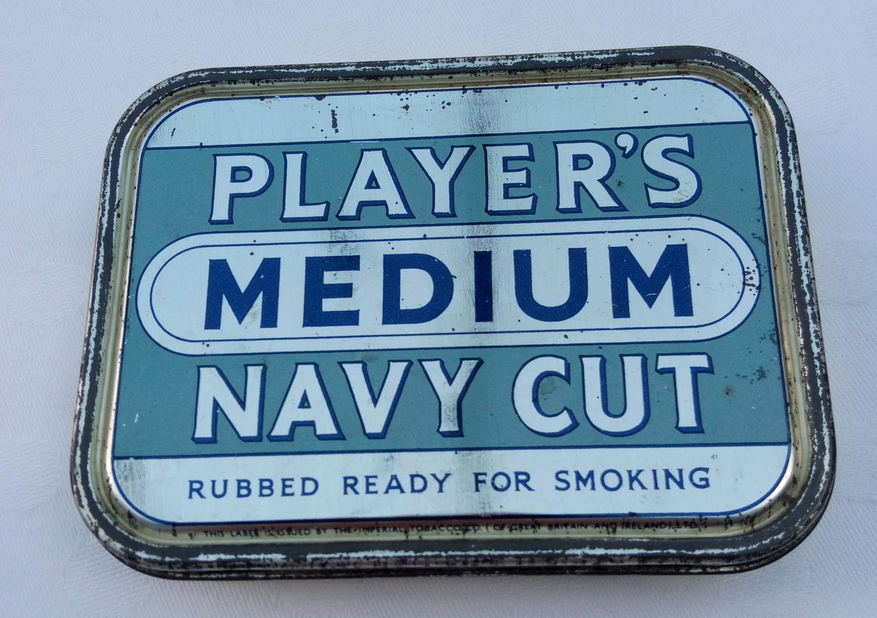 The tin's aesthetic appeal is undeniable. Its overall shiny, silver finish radiates a classic, understated elegance, while the deep blue lettering on the lid provides a striking contrast, making the "Player's" and "Medium Navy Cut" branding pop. Although some of the finish shows signs of wear, a subtle testament to its age and past use, the tin remains in very good condition. You'll be pleased to find no dents, scratches, or rust, a rare state for an item of this vintage.
