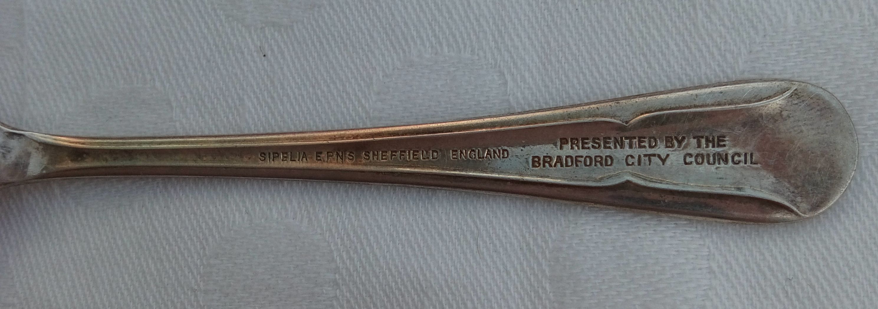 Crafted with care, the spoon's handle is adorned with an elegant crown and the date "1953," celebrating the dawn of a new Elizabethan era. The design is further enhanced by the classic English Rose, a timeless symbol of the nation. On the reverse, its provenance is clearly stamped: "Sipelia EPNS Sheffield," the mark of its reputable makers, and "Presented by the Bradford City Council." This inscription tells a unique story, suggesting it was likely a cherished memento given to a school child in Bradford to mark the historic occasion. Imagine the pride and excitement of a young person receiving this item, a memory of a day filled with pomp and pageantry.