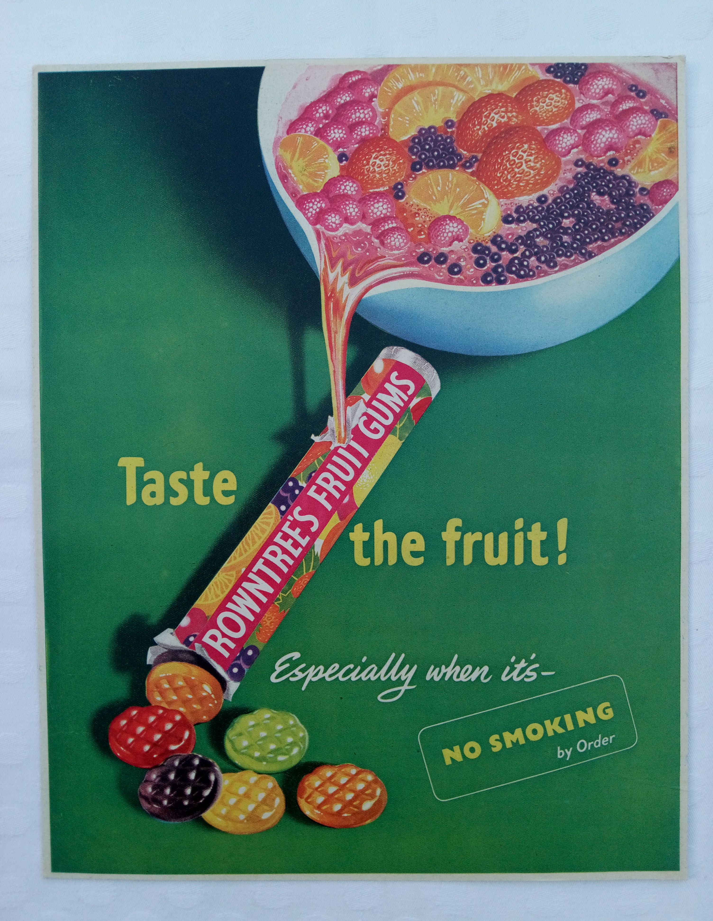 The most striking aspect of this piece, however, is the bold, confident text below the image. In a world now so conscious of health, this advertisement for fruit gums makes a daring and historically significant claim: it is presented as a substitute for smoking. This wasn't just a sweet; it was a healthier alternative, a way to satisfy a craving with something sweet and fruity instead of a cigarette. This particular detail dates the piece definitively and makes it a fascinating window into the mid-20th century, where public health messaging was just beginning to take shape.